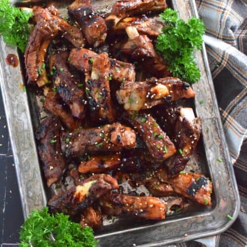Once you’re happy with the grill marks, get the ribs off the grill. Garnish with sesame seeds and green onions or chives. Serve immediately.