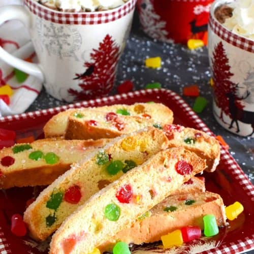 Gumdrop Biscotti just might be the Christmas confection you didn't know you needed! These buttery biscotti are packed with everyone's favourite baking gums and topped with sweet, glistening coarse sugar. Adorably festive, these make a great gift idea!