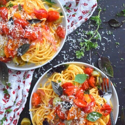 Herb and Garlic Tomato Spaghetti is one of those quick and easy recipes that taste wonderfully delicious! This simple pasta is prepared using fresh herbs like thyme, oregano, and chives. Cherry tomatoes are blistered with red onions in olive oil to create a sauce. Tossed with perfectly cooked pasta, this dish is a family-friendly meal, but impressive enough for any dinner party!