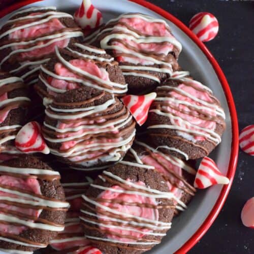 These soft chocolatey Hershey's Peppermint Cookies are baked and then topped with a peppermint kiss as soon as they come out of the oven. Once softened, the kiss is swirled to cover the top of the cookie and then drizzled with melted white chocolate.