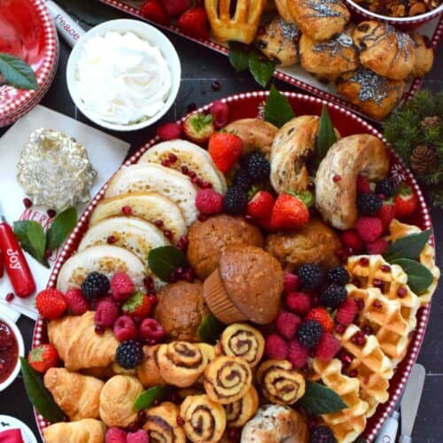 Gather together a bunch of breakfast items and assemble this super easy Holiday Breakfast Buffet! Your guests and family will love filling up on these morning favourites. Set the platters right in the middle of your table or kitchen counter and let everyone help themselves!