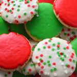 Working with one cookie at a time, dip a third of the cookies in the white frosting and set them onto a wire cooling rack. Top with sprinkles. Dip another third into the red frosting and the remaining third into the green.