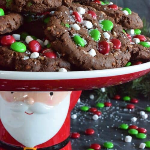 Holiday Trash Cookies are loaded with both milk and white chocolate chips, M&Ms, crushed pretzels, and marshmallow bits too! The cookie dough is prepared with brown sugar, which means these cookies are soft and moist on the inside, but they have a crisp exterior! Make a delightfully tasty gift by packaging these festive cookies up in boxes and tying them with a bright festive ribbon!