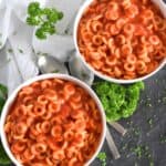Store-bought, canned, o-shaped pasta in tomato sauce was a favourite meal of every kid in the 80s and 90s. Homemade Copycat Spaghettios allows you to enjoy your favourite childhood pasta without all of the preservatives and additives. The sauce is so quick and easy to make, and this dish comes together in the amount of time it takes to boil the pasta!