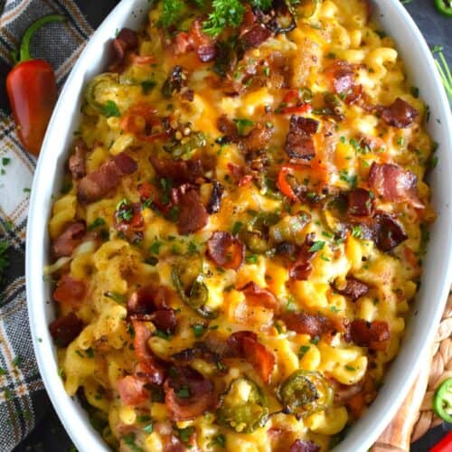 Macaroni and Cheese is always good even when it's bad, but you haven't tasted good until you've feasted on this Jalapeno Popper Mac and Cheese! Not only is it the cheesiest and creamiest, but it's also loaded with jalapenos, crispy bacon, fresh green onions, and chopped tomatoes too!