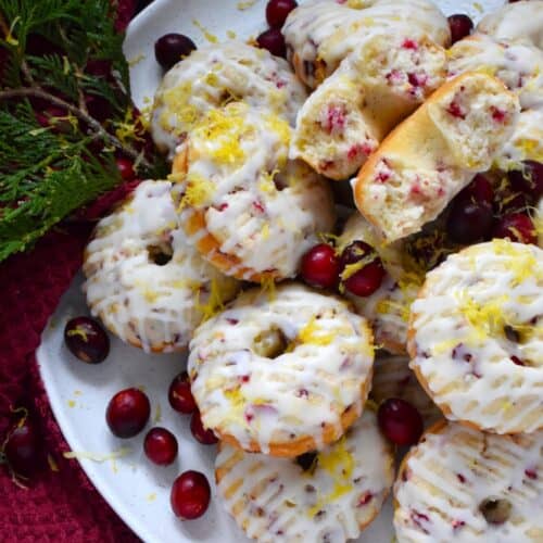 The tartness of lemon and cranberries are well balanced with sugary sweetness in these delightfully refreshing Lemon Cranberry Donuts! Prepared with freshly squeezed lemon juice and lemon zest, chopped cranberries, and a lemony glaze, these donuts are simply irresistible!