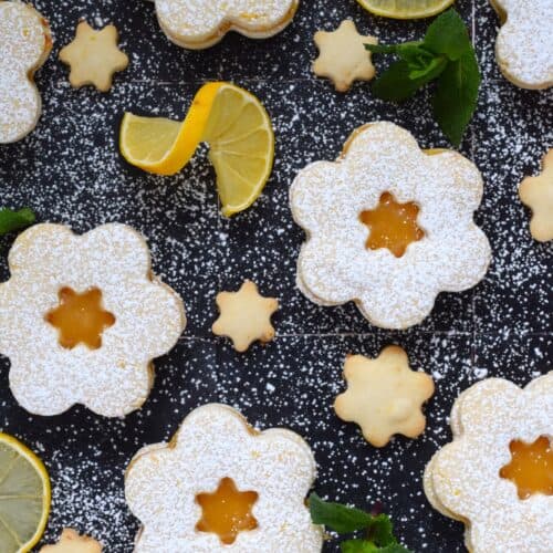 This recipe starts with an easy to prepare shortbread cookie that is generously infused with freshly grated lemon zest. Once baked and cooled, the cookies are sandwiched together with lemon curd. Dusted with confectioner's sugar, these light and airy cookies are super refreshing and make a perfect Easter treat or springtime brunch dessert!