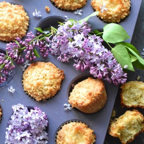 Mildly sweet Lilac Streusel Muffins are made with real lilac flowers, sweetened with homemade lilac sugar, and tinted with a floral, fragrant homemade lilac syrup. If that wasn't enough, the streusel crumb topping is super easy to make and adds a nice flaky crunch to the top of the deliciously soft and moist muffin!