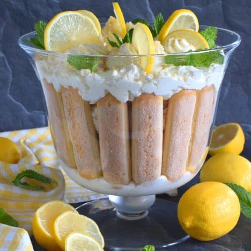 Before serving top with fresh lemon zest, crushed ladyfingers, sliced fresh lemons, and fresh mint leaves. (This step is optional.)