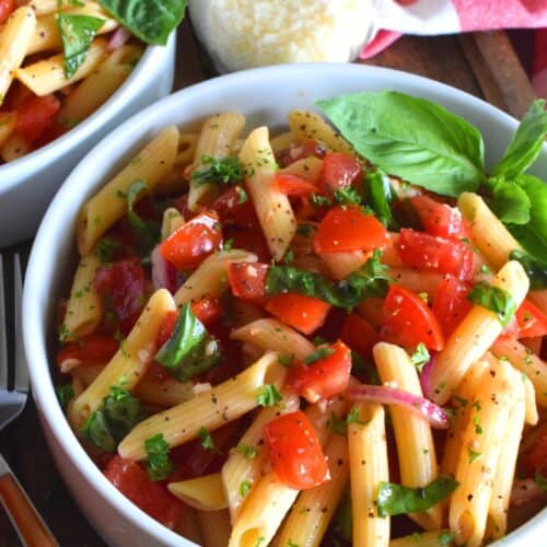 This is the ultimate summer pasta salad! Fresh tomatoes are marinated with olive oil, garlic, red onions, and balsamic vinegar before being tossed with cooked pasta and fresh basil. A terrific way to use your best summer fresh tomatoes!