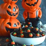 These festive cookies are deliciously decadent. The base is a chocolate cookie that has been darkened to resemble the blackness that goes hand in hand with Halloween. Before baking, the cookie is rolled in black sanding sugar which adds a glistening effect. Finally, a Mellocreme Pumpkin is pushed into the center to make these one of the most adorable Halloween cookies!