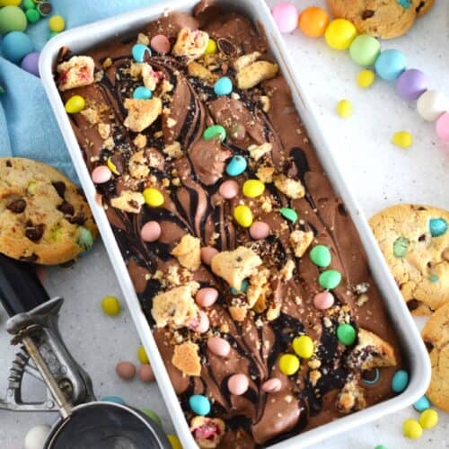 Developed with the chocolate mini egg enthusiast in mind, this no churn ice cream is so quick and easy to prepare! Smooth and velvety, flavoured and enriched with good cocoa, this ice cream is loaded with Cadbury Easter chocolate eggs, crumbled chocolate cookies, and even a chocolate syrup drizzle!