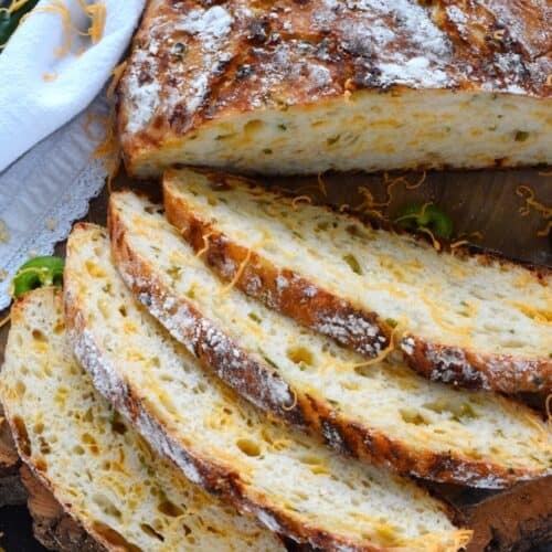 There’s something really soothing and satisfying about freshly baked bread. Even more so when you bake that bread yourself! No Knead Jalapeno Cheddar Bread is one of the most delicious and easiest breads you'll ever make! Loaded with freshly chopped jalapenos and grated cheese, this bread is cheesy and moderately spicy - perfect to dip into soup!