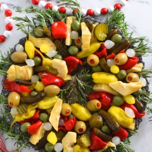 This bright and shiny edible wreath is packed full of sweet, salty, and tangy flavour! Consisting of your favourite pickled and marinated foods, an Olive and Pickle Wreath is the answer to every host's holiday appetizer table. Assemble on a platter and refrigerate until ready to serve. It's easy, delicious, and festive!