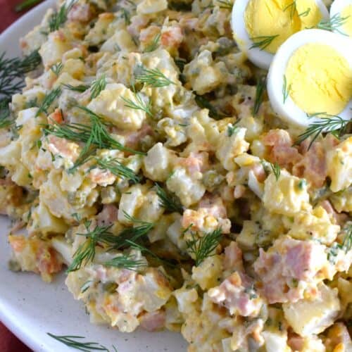 This salad might be more popular in Europe, but there is no reason why anyone shouldn't get to enjoy this creamy, delicous salad. Olivier Potato Salad is very hearty; prepared with eggs, ham, carrots, and pickles, this salad is full of robust flavour! Serve as a side, or even as a course if preparing for a fancy dinner!