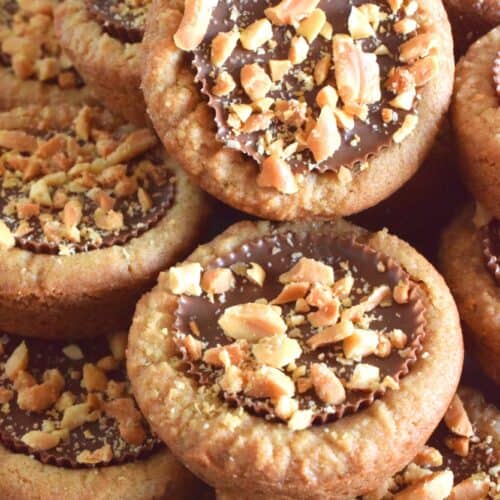 Thumbprint-style cookies are very popular at Christmastime, so why not over-stuff them with a full-sized Peanut Butter Cup? These cookies are so easy to make and are baked in muffin tins! Push in the peanut butter cup and top with chopped peanuts for more texture and flavour!