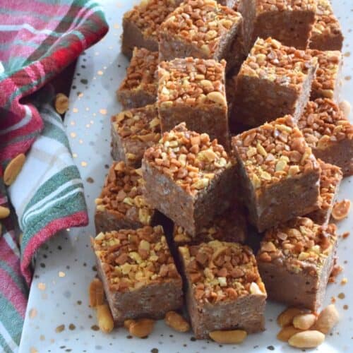 These no-bake bars are super delicious! Prepared with both milk chocolate chips and peanut butter chips, these Peanut Crunch Bars are loaded with crispy rice cereal, toffee bits, and chopped, salted peanuts too! Who needs store-bought treats when you can whip up a batch of these in mere minutes!?
