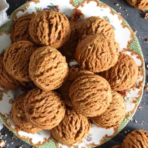 These plump, soft cookies are made with lots of familiar spices associated with fall baking. Pecan Molasses Cookies are very easy to prepare; simply make the cookie dough and use a cookie scoop to portion out mounds onto your baking sheet. Let your oven do the rest! These are one of my all-time favourite cookies!