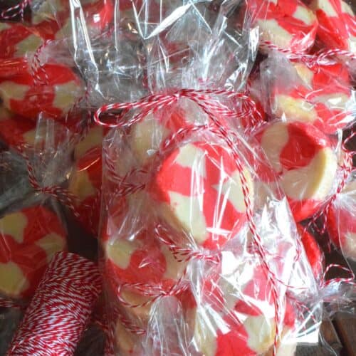 The perfect gift-giving cookie, Peppermint Candy Wheels are individually wrapped in cellophane and tied with a festive string. They may look impressive and maybe even tedious and time consuming, but these cookies really couldn't be easier! And besides, whomever you share these with will certainly appreciate the effort!