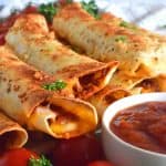Prepared with homemade sun dried tomato pesto and lots of melted, gooey cheese, Pesto Pizza Taquitos are baked in the oven with a garlic and parmesan topping. Sounds irresistible, right?