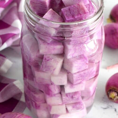 Great as a snack, served on a charcuterie board, tossed in a salad, or simply enjoyed as a cooling crunch after eating hot and spicy food. Pickled Diakon Radish takes about ten minutes to prepare and will keep safely in your refrigerator for up to four weeks!