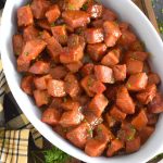 If you’re working with a boneless ham, this step will be super easy. If, however, you have a bone-in ham, you will need to get a little bit more creative with cutting the ham into pieces. It’s important to remember that while the ham bakes, it will shrink a little, so be sure to cut your ham into one and a half inch chunks. If you cut them too small, the ham will dry out.