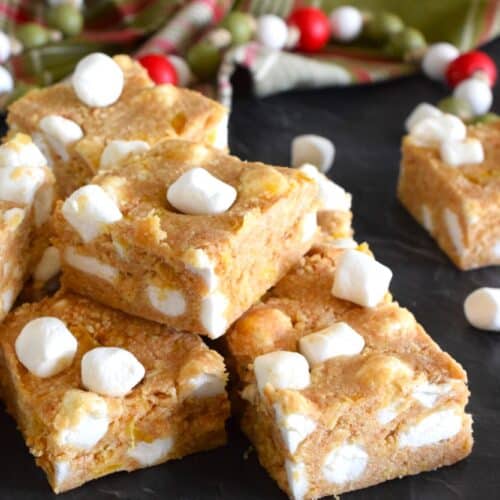 This no-bake recipe requires only four ingredients and about ten minutes of your time. Pineapple Marshmallow Squares are soft, moist, and chewy. They are great for freezing and can be prepared weeks or even months in advance! Optionally, add a splash of rum for a Christmas in the tropics flair!