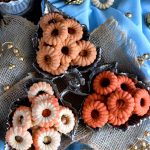 In the photographs, you will note there are different colours of cookies. I divided the dough into three equal portions and added a little bit of brown food colouring to one bowl, and a little bit of peach food colouring to another bowl. The third bowl of dough was left without colouring. Beat the colours into the dough until well incorporated.I started pressing the dough with my cookie press, starting with the brown dough first. I did not clean out the press after each colour on purpose. That is why some of the cookies are a solid colour and others blended. This is just an option. You don't have to use food colouring at all. You can also clean the cookie press after you use up each colour to keep the colours from mixing.