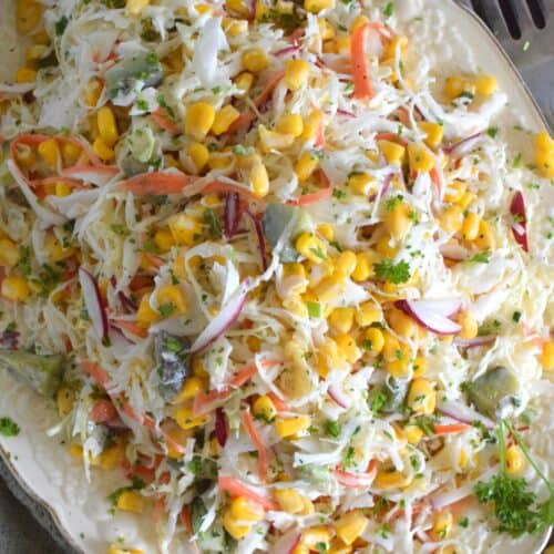 Peppery radish, crisp corn, creamy avocado, fresh green onions, sweet carrots, and crunchy cabbage all meet in the middle to create this most delicious Radish and Corn Coleslaw. With its creamy, zesty, and tart dressing, this coleslaw will most definitely please the toughest critic!
