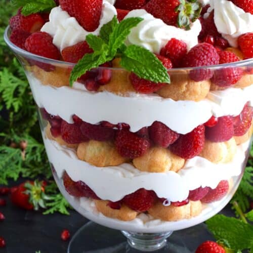 Profiteroles are a super light and airy choux pastry filled with cream, which makes them perfect for a decadent, rich, gorgeous Red Berry Profiterole Trifle! Any red berries will do here, but I love the sparkle of pomegranates and red currants paired with plump, fresh raspberries and strawberries. This is a super impressive dessert that is extremely easy to prepare!