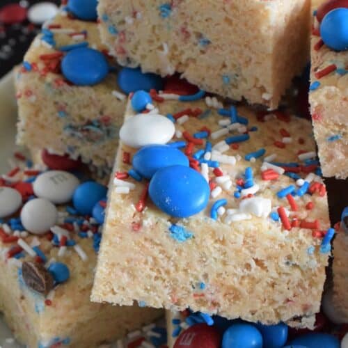 Everyone's favourite treat, these Rice Krispie Squares are loaded with red, white, and blue candy-coated chocolates as well as festive sprinkles. Easy to prepare and fun to eat, these can be prepared with regular or vegan marshmallows if you have any dietary restrictions.
