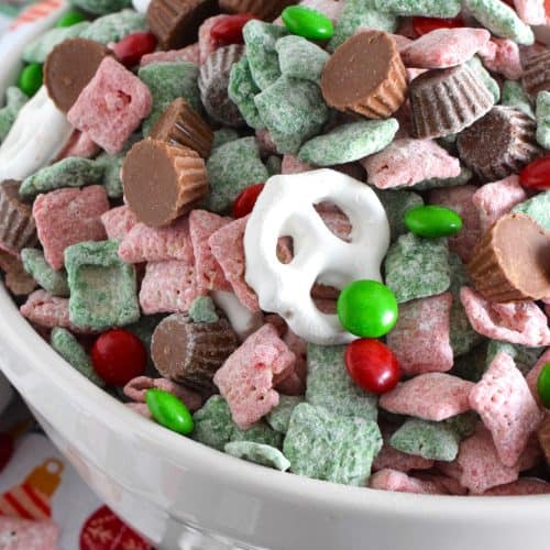 Package up a treat bag full of this Reindeer Chow for your workmates, friends, and neighbours this holiday season! Loaded with pretzels, candy, peanut butter chocolates, and candy coated cereal, this sweet and salty snack will disappear quite quickly! Alternatively, set out a big bowl with cellophane bags and ribbon and encourage friends and guests to help themselves before leaving your holiday party!