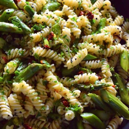 A dish that can only be described as springtime in a bowl, this simple butter roasted asparagus pasta salad, tossed with sun dried tomatoes, fresh lemon, and parmesan. A delightful cold pasta salad that everyone will love!
