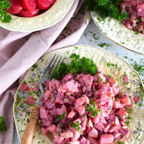 One of my favourite ways to cook with beets is to add them to a deliciously savoury potato salad. This Russian Beet and Potato Salad combines beets with potatoes, carrots, peas, and onions. Tossed in a slightly sweet creamy sauce, this beautifully pink salad is both rustic and impressive!