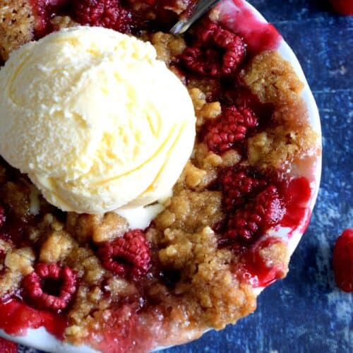 Made from simple ingredients, Rustic Raspberry Crumble is an impressive dessert with very little effort! For added pizzazz, prepare the mixture in individually portioned dessert ramekins; they're much more impressive that way! And, of course, no matter how delicious a crumble might be, it always needs a scoop of good vanilla ice cream!
