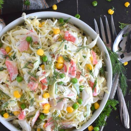 Chunks of crab and lobster are tossed with lots of fresh vegetables, like cabbage, cucumber, corn, peas, and green onions in a homemade creamy, tangy, and savoury dressing. Consider your budget and use real seafood or imitation crab and lobster to make this absolutely refreshing Seafood Coleslaw Salad!
