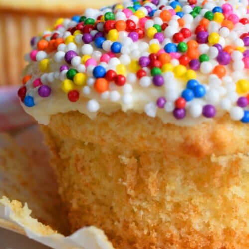 With perfect results every time, Simple Vanilla Cupcakes are the ultimate go-to recipe for birthdays, special occasions, or just because! Top these with your favourite homemade or store-bought frosting and be sure to add lots and lots of sprinkles too!