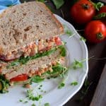 Evenly distribute the lentil mixture over 4 slices of the bread. Top each of those sliced with sliced tomatoes, watercress, and microgreens. Place the remaining slices of bread on top and cut sandwiches in half.