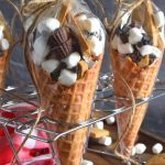 Prepare a bunch of these S'mores Campfire Waffle Cones and wrap them in aluminum foil. Set them onto a grilling rack over the fire for a few minutes and they will be all melty and gooey on the inside, but contained within the cone. No more sticky fingers! Serve the cones with a spoon and enjoy!