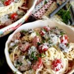 Once the pasta is well coated and reheated (approximately 2 minutes) add the chopped tomatoes, parmesan, and parsley. Toss once again.