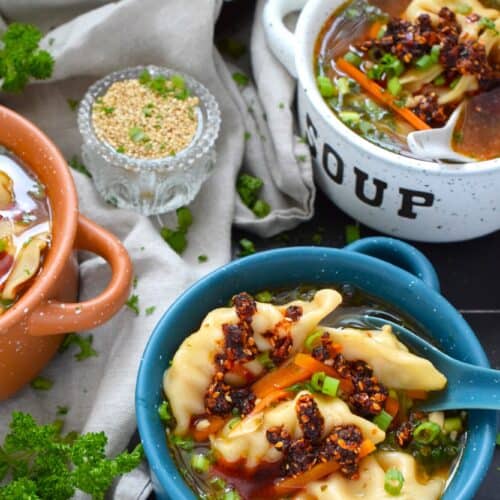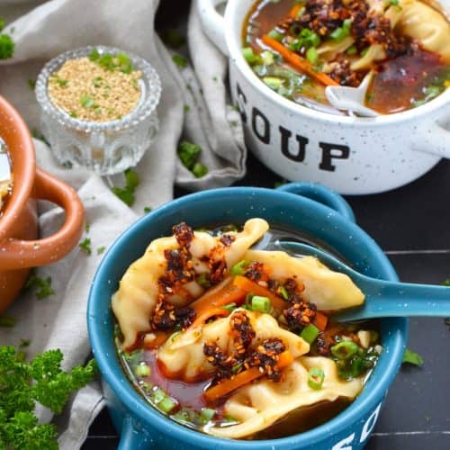 Pick up a package of frozen potstickers, wontons, or dumplings from your local grocery store and cook them in a savoury broth to make the most deliciously wonderful Spicy Potsticker Soup. Loaded with green onions, garlic, ginger, and carrots, this soup is good for you too!