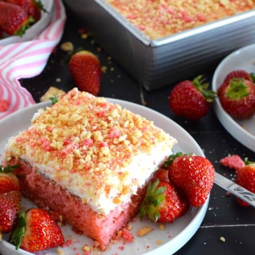 This light and fluffy cake is super flavourful! Prepared with a boxed strawberry mousse mix and a cream cheese frosting, Strawberry Pudding Shortcake is topped with homemade strawberry shortcake crumbs which help to make it the most deliciously nostalgic flavour combination!