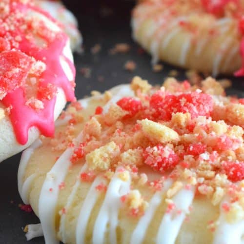 The uncomplicated and delicious sugar cookie gets a fresh, new flavour profile, and an upgrade in this Strawberry Shortcake Sugar Cookies recipe. A classic sugar cookie base is topped with a simple glaze and sprinkled with homemade shortcake crumbs. These would make a great giftable dessert idea for Valentine's Day!