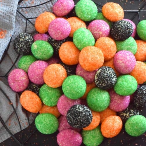 Just in time for the little trick-or-treaters in your life, these melt-in-your-mouth orange, green, purple, and black cookies are about to become everyone's favourite Halloween treat! Sugared Halloween Cookies are made with just five ingredients, and they're quick and easy too!
