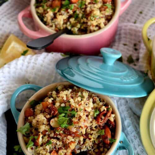 A light and refreshing salad prepared with healthy pantry ingredients, this Sun Dried Tomato and Almond Quinoa Salad is delightfully easy to make and a great way to use up any leftover quinoa!