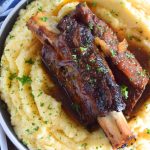 Pile the cooked short ribs back into the pot. Pour the sauce mixture over top. Move the short ribs around so that they are covered by the sauce as much as possible. Place a lid on the pot and bake for two hours, checking and gently stirring every 30 minutes.