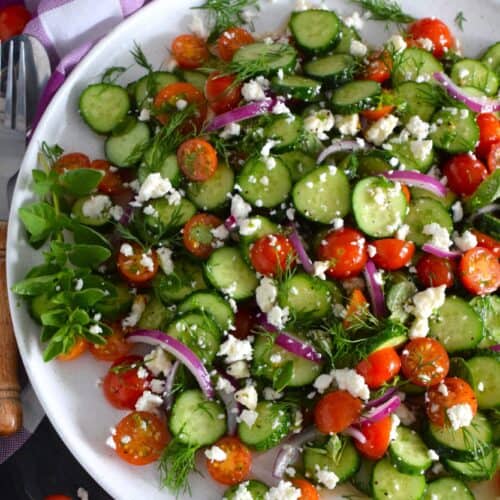 Tomato and Cucumber Salad screams summer freshness! Prepared with sliced cucumbers, cherry tomatoes, sliced red onion, and fresh dill, this salad tastes divine. Tossed in an aromatic, seasoned dressing made with vinegar and avocado oil, crumbled salty cheese is added for flavour and creaminess.