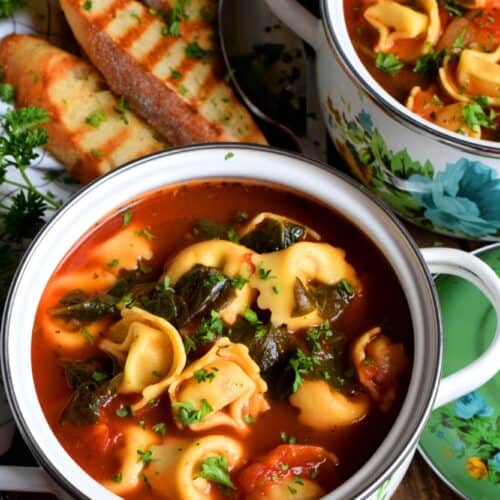 This soup is a complete meal! Not only is it hearty and filling, it's also very delicious! Tomato Tortellini Soup is a wholesome and nutritious meal that is quite easy to prepare and only takes about forty minutes from start to finish! It's loaded with aromatics and fresh spinach too!