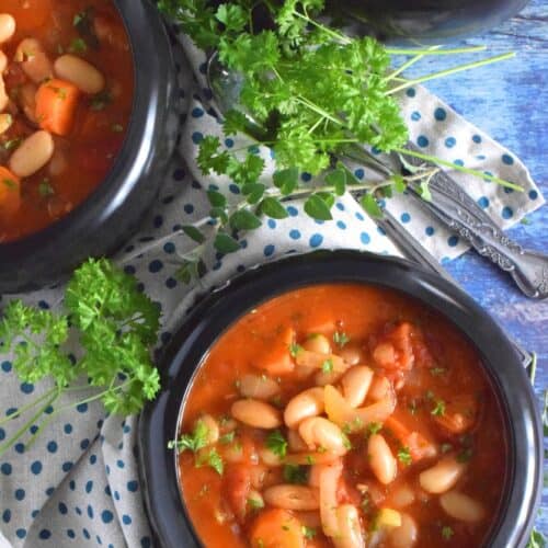 This soup is thick, hearty, and filling! Tomato Vegetable Soup is in fact more like a stew than a soup! It has a dense, homestyle tomato flavour combined with the creaminess of tender white beans, and is paired with lots of fresh and good-for-you vegetables too. Yummy! Sounds good to me!