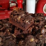 Fetch the melted caramel sauce and drizzle it over the chocolate brownie mixture. Use a butter knife to lightly drag the melted caramel through the brownie mixture.